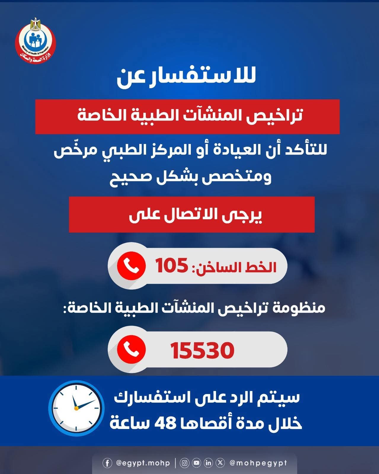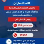 للاستفسار عن تراخيص المنشآت الطبية الخاصة والتأكد من أن العيادة أو المركز الطبي مرخّص ومتخصص بشكل صحيح، يرجى الاتصال على الخط الساخن ١٠٥ الخط الساخن الخاص بمنظومة تراخيص المنشآت الطبية الخاصة : ١٥٥٣٠