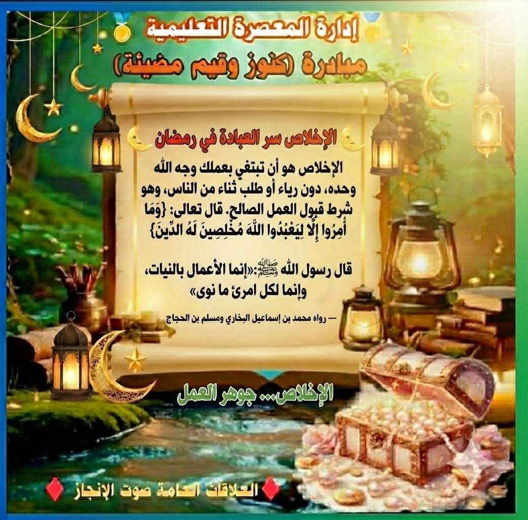 🔴 إدارة المعصرة التعليمية 🔴 ♦️ منارة الإبداع والتغيير ♦️ 🌜 رمضان مبارك 🌜 ♦️ تقبل الله منا ومنكم صالح الأعمال ♦️ تنفيذا لتوجيهات الدكتورة / همت أبو كيله وكيل أول الوزارة – مدير مديرية التربية والتعليم بالقاهرة تفعيلاً لمبادرة بقيمنا تحلو أيامنا 🌟 تحت رعاية الأستاذ/ محمود عبد الرازق مدير عام الإدارة والأستاذة/ ريهام سمير ذكرى وكيل الإدارة انطلاق مبادرة (كنوز وقيم مضيئة) لتأصيل القيم التربوية والأخلاقية في بيئة العمل