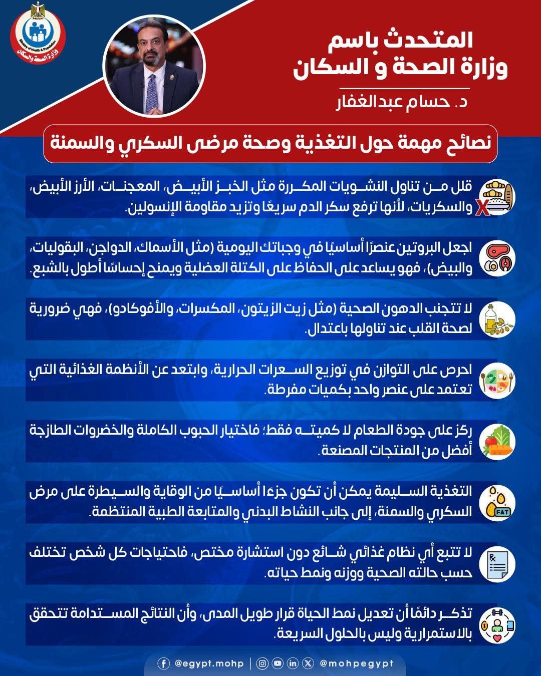 متحدث الصحة: نصائح غذائية مهمة للعناية بصحة مرضى السكري والسمنة.. #هنتغيّر