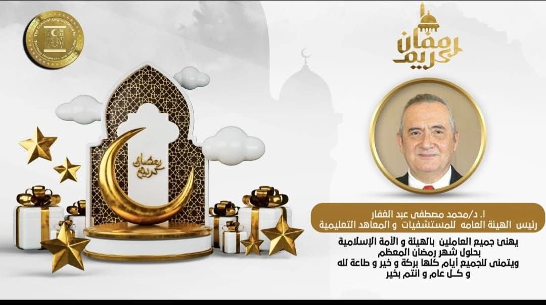يتقدم أ. د. محمد مصطفى عبد الغفار- رئيس الهيئة للمستشفيات والمعاهد التعليمية بأصدق التهانى القلبية لجميع العاملين بالهيئة بمناسبة قدوم شهر رمضان المعظم .. أعاده الله علينا وعلى الأمة الإسلامية بالخير واليمن والبركات.
