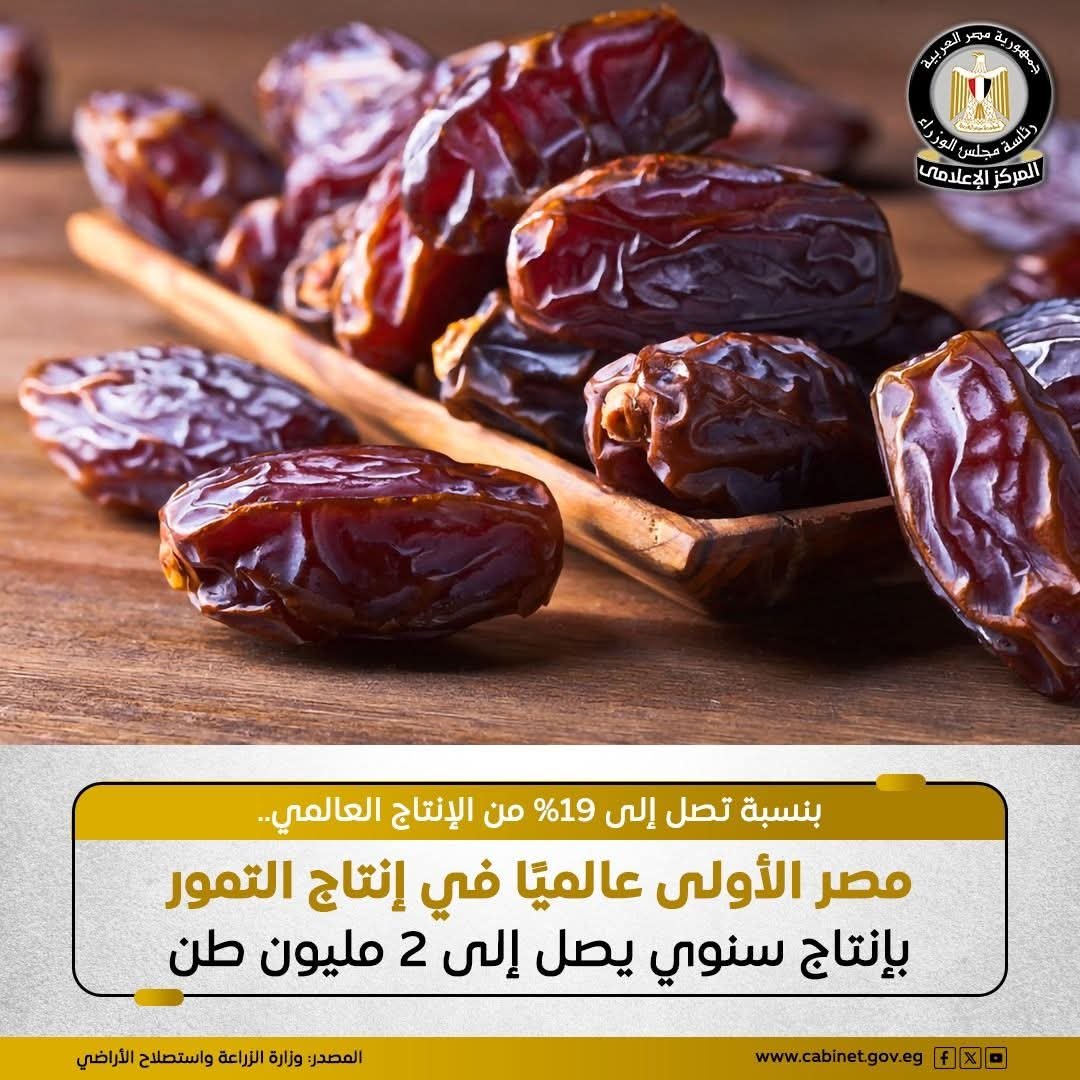📍 أعلنت وزارة الزراعة واستصلاح الأراضي، أن مصر تحتل المرتبة الأولى عالميًا في إنتاج التمور ، بإنتاج سنوي يصل إلى 2 مليون طن، كما أنها تمتلك أكثر من 24 مليون نخلة، وخطط للتوسع في زراعة الأصناف عالية القيمة التصديرية