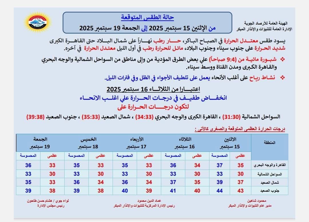 🔹 حالة الطقس المتوقعة في الفترة من الإثنين 15 سبتمبر وحتى الجمعة 19 سبتمبر 2025👇👇