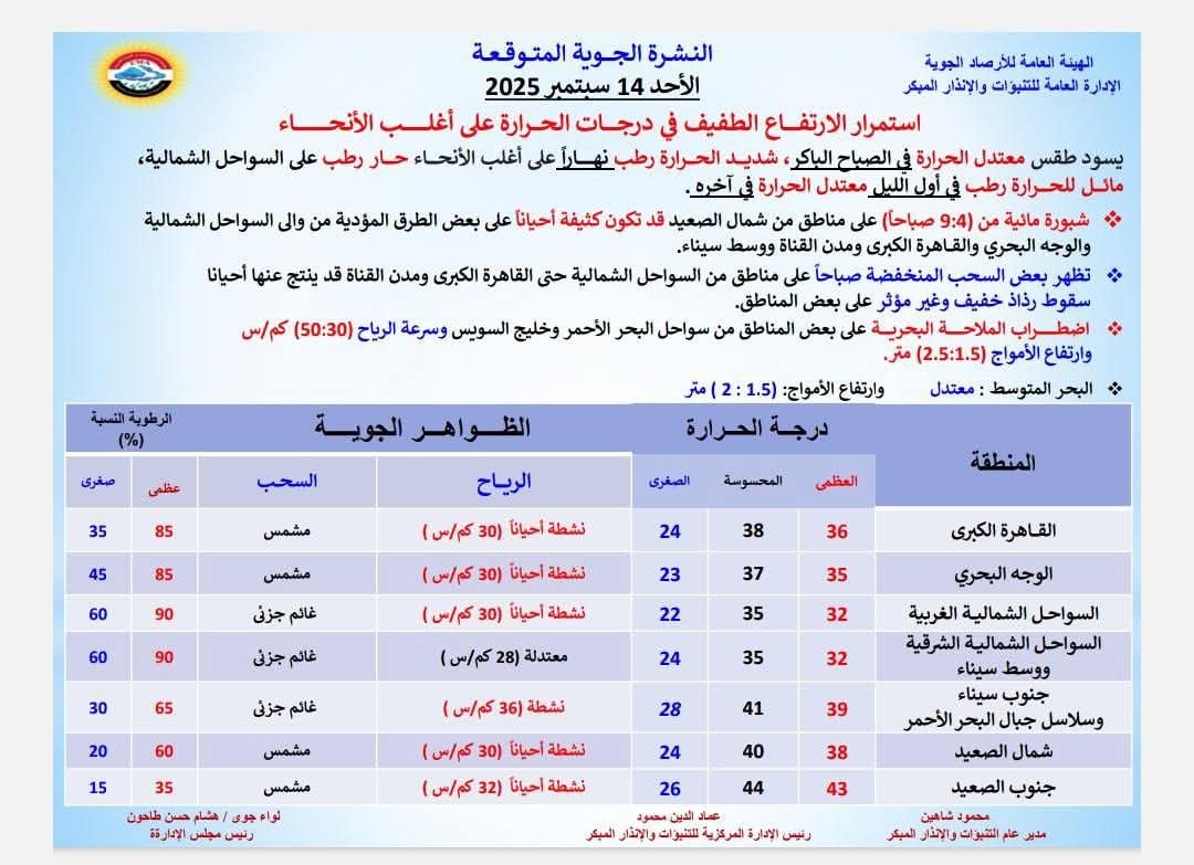 🔹 حالة الطقس والظواهر الجوية المتوقعة ليوم غد الأحد الموافق 14 سبتمبر 2025👇👇