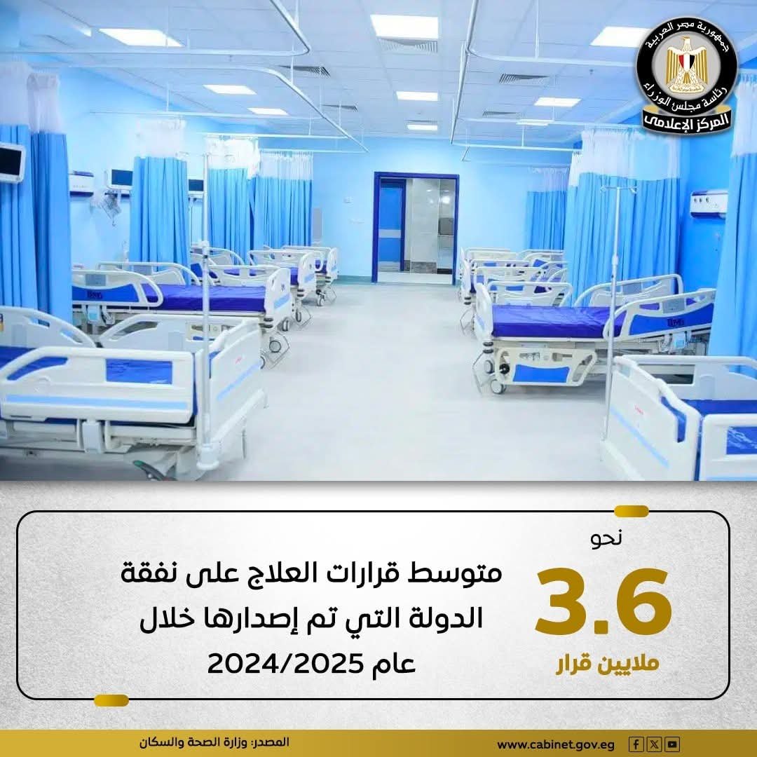 ، ويمكن الاستعلام عن نتائج قرارات العلاج عبر البوابة الإلكترونية لوزارة الصحة باستخدام الرقم القومي من خلال الرابط التالي: https://wlms.smcegy.com/WLMSOnline/Online/InsuranceDetails?DecType=2&IsTransfer&fbclid=IwY2xjawLRxplleHRuA2FlbQIxMABicmlkETFDdVdGOVJFZ2taVXoxTnpyAR7ozNOBCT8yPyTNKWKFbviVRIr8ohlclBmPVjGSxFfNe_inoVHD0pWGRrjQMA_aem_ugCKSaXnp98T-8dafsWqmg #وزارة_الصحة_والسكان #المركز_الإعلامي_لمجلس_الوزراء #رئاسة_مجلس_الوزراء