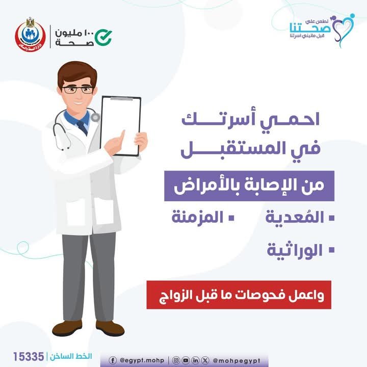 🟪 لمعرفة أقرب وحدة صحية يمكنك الاتصال بالخط الساخن ١٥٣٣٥ أو زيارة الموقع الإلكتروني: Www.100millionseha.eg #مبادرة_المقبلين_على_الزواج
