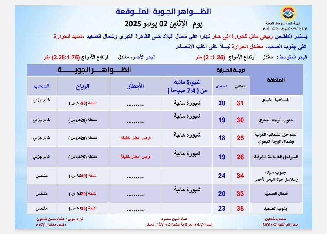 📌درجات الحرارة والظواهر الجوية المتوقعة اعتباراً من غدٍ الإثنين الموافق 02 يونيو إلى السبت 07 يونيو 2025 👇