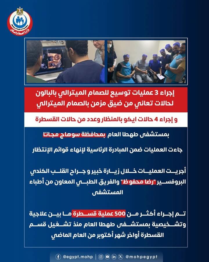 أجريت العمليات خلال زيارة خبير و جراح القلب الكندي البروفسير "رضا محفوظ" والفريق الطبي المعاون من أطباء المستشفى تم إجراء أكثر من 500 عملية قسطرة ما بين علاجية وتشخيصية بمستشفى…