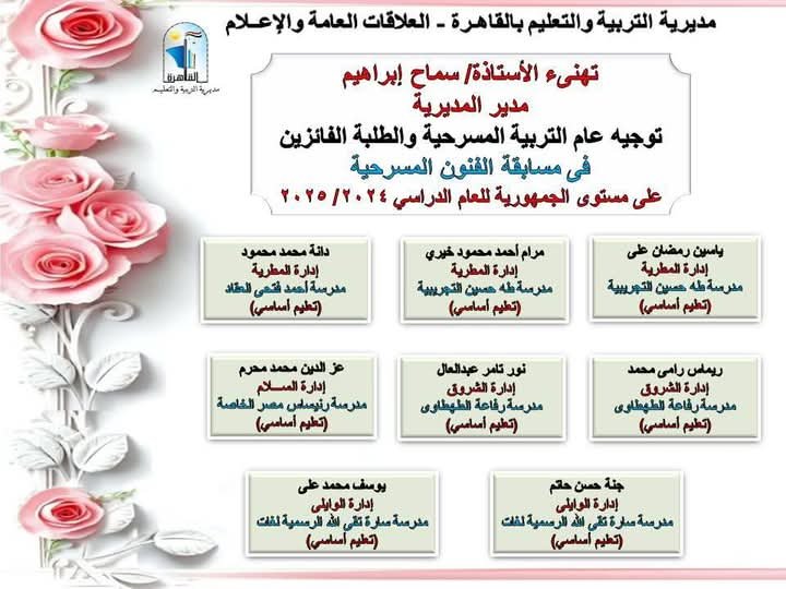 //ــــــــــــــــــــــــ//ــــــــــــــــــــــــ// حصدت مديرية التربية والتعليم بالقاهرة المراكز الأولى على مستوى الجمهورية فى مسابقة الفنون المسرحية للعام الدراسي ٢٠٢٥/٢٠٢٤ وتقدمت الأستاذة/ سماح إبراهيم مدير مديرية التربية والتعليم بالقاهرة بأجمل وأرق التهاني…