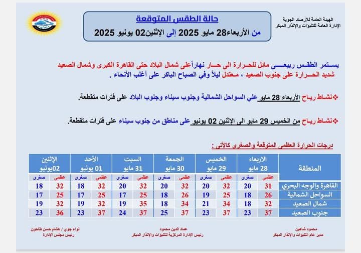 ☘️متابعينا الكرام 🍃إليكم درجات الحرارة والظواهر الجوية المتوقعة اعتباراً من غدٍ الأربعاء ٢٨ مايو إلى الإثنين ٢يونيو ٢٠٢٥.🍃