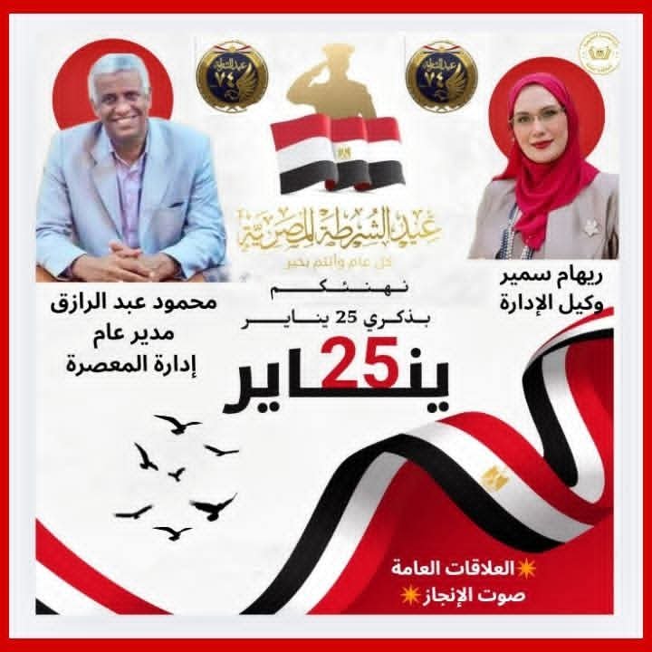 ♦️ إدارة المعصرة التعليمية ♦️ ☀️منارة الابداع والتغييير☀️ 💥انتصارات.....واعياد💥 🥇يتقدم الأستاذ /محمود عبد الرازق مدير عام الإدارة 💫والأستاذة /ريهام سمير وكيل الإدارة ✍️بخالص التهنئة إلى جميع العاملين وأبناء الوطن بمناسبة…