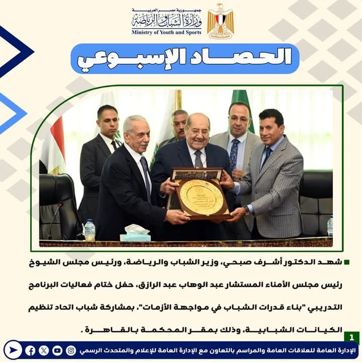 بيان صادر عن وزارة الشباب والرياضة: أصدرت وزارة الشباب والرياضة تقريرها الأسبوعي بالانفوجراف والذي يتضمن أهم اجتماعات وزيارات الأستاذ الدكتور أشرف صبحي وزير الشباب والرياضة ونستعرض أهمها في التقرير التالي: