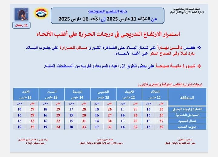 الهيئة العامة للارصاد الجويه ☘️متابعينا الكرام ؛ إليكم درجات الحرارة والظواهر الجوية المتوقعة اعتبارا من الثلاثاء ١١ مارس حتى الأحد ١٦ مارس ٢٠٢٥.