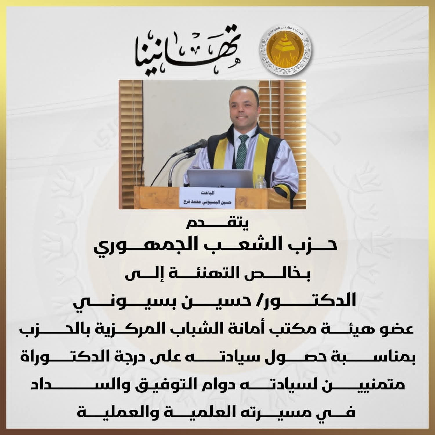 يتقدم حزب الشعب الجمهوري بخالص التهنئة إلى الدكتور حسين بسيوني عضو هيئة مكتب أمانة الشباب…