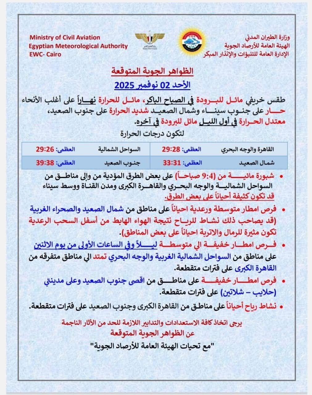 📌تنويه هاااام ؛ 🌁تزداد كثافة الشبورة المائية وقد تصل لحد الضباب 🌫️وتؤدى الى انخفاض الرؤية…