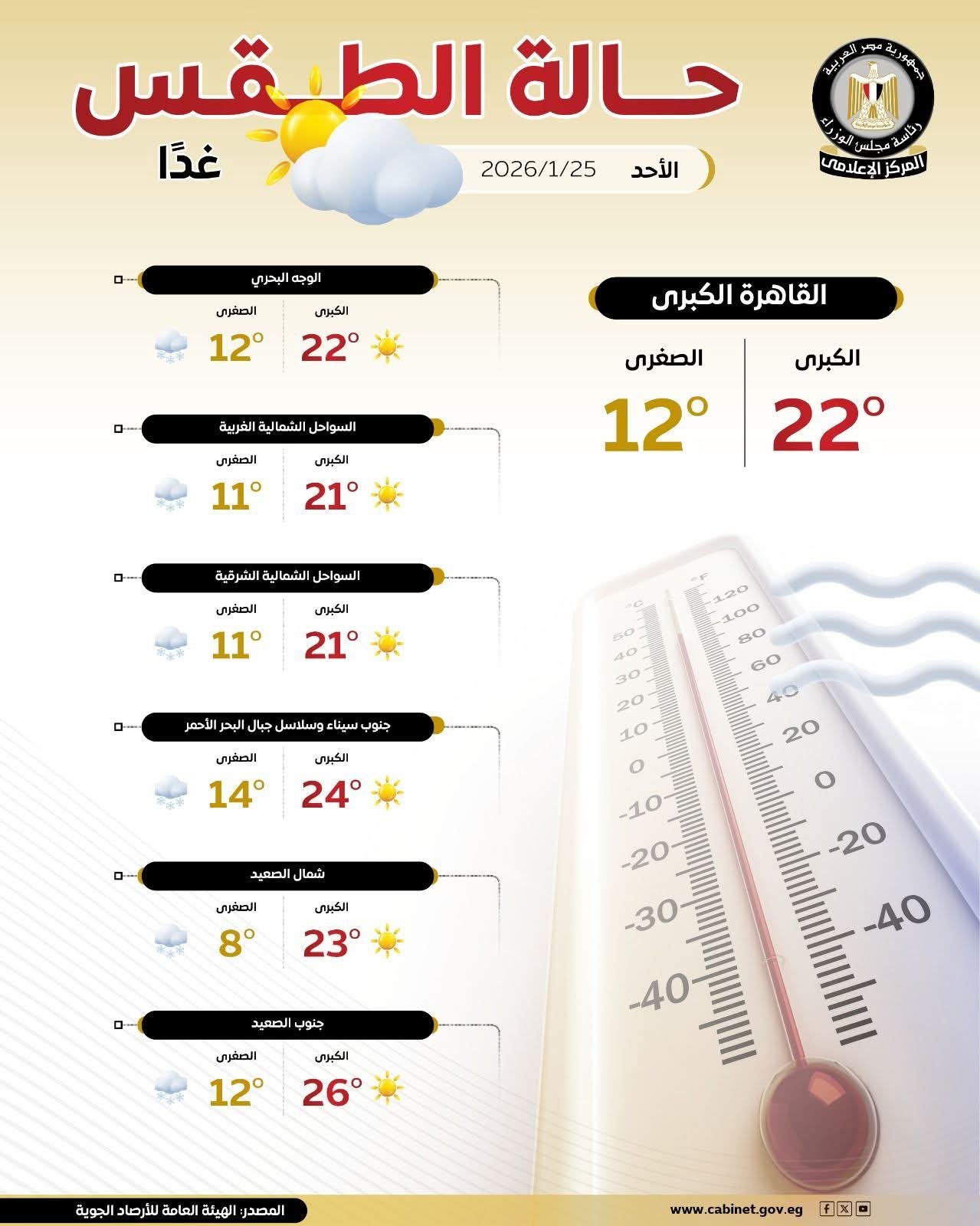 🟥 النشرة الجوية والظواهر الجوية المتوقعة ليوم غد الأحد الموافق 25 يناير 2026👇👇👇
