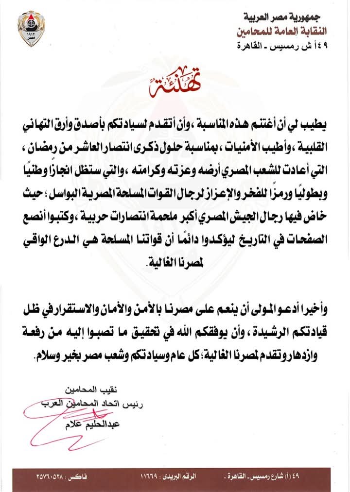 نقيب المحامين يهنئ رئيس الجمهورية والقوات المسلحة والشعب المصري بذكرى انتصار العاشر من رمضان قدم…